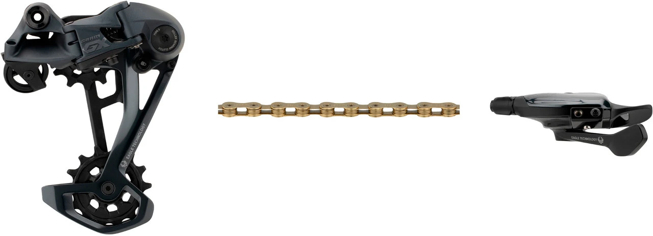 Schaltwerk:lunar (dunkelgrau)Schaltgriff:lunar (dunkelgrau)Kette:nach Wahl XX1 rainbow (bunt), XX1 copper (kupferrot), XX1 gold, XX1 black, GX silver-blackHerstellernummern:Schaltwerk: 00.7518.137.000Schaltgriff: 00.7018.431.000Kette: 00.2518.039.010 (XX1 rainbow), 00.2518.043.010 (XX1 copper), 00.2518.024.020 (XX1 gold), 00.2518.024.021 (XX1 black), 00.2518.030.011 (GX silver-black)Lieferumfang:1 x Schaltwerk SRAM GX Eagle1 x Schaltgriff SRAM Trigger GX Eagle 12-fach1 x Kette SRAM PC XX1 Eagle oder PC GX Eagle (nur GX silver-black)1 x Kettenschloss SRAM PowerLock1 x Klemmschelle SRAM1 x Schaltzug SRAM 2200 mm1 x Einstelllehre SRAM Chain Gap Adjustment GaugeDirekt mitbestellen:SchaltzugauĂenhĂŒlle