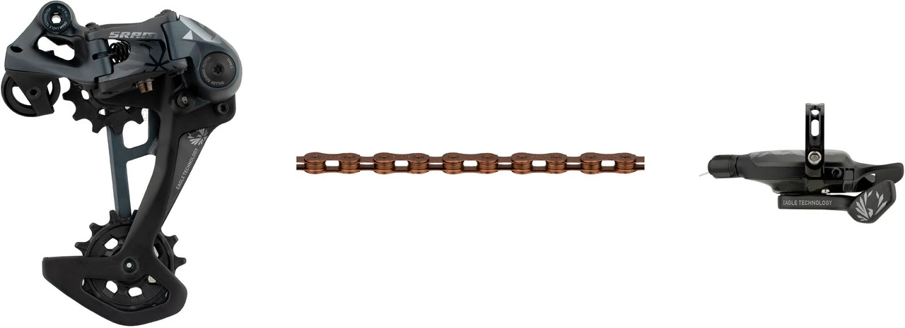 Dieses SRAM Upgrade-Kit der Serie XX1 Eagle fĂŒr 1×12-fach-Antriebe bietet leichte Schaltkomponenten mit Carbon fĂŒr Dein Cross-Country- oder All-Mountain-Bike. Es setzt sich zusammen aus einem XX1 Eagle Schaltwerk, passendem XX1 Eagle Trigger Schaltgriff und einer PC XX1 Eagle Kette.
